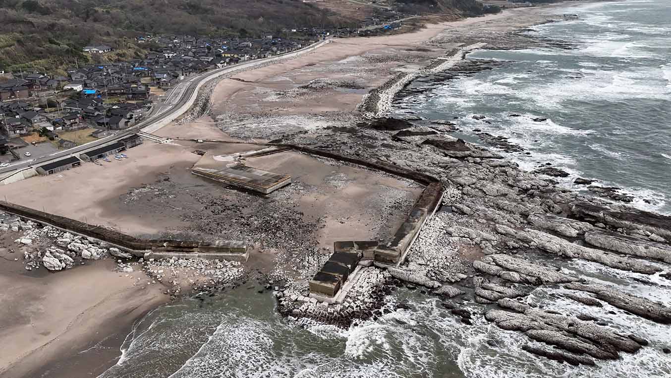 国土交通省によると、輪島市付近で南西方向に約2メートルの地殻変動、輪島市西部で最大約4メートルの隆起が確認された。輪島市門前町の鹿磯漁港は約4メートル隆起し、海岸線が沖まで100メートル以上後退。黒島漁港は干上がった状態になった。