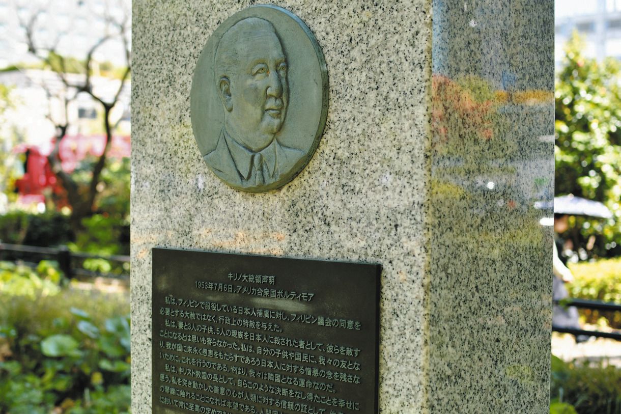 戦犯に恩赦を与えたキリノ大統領をたたえる記念碑=東京・日比谷公園で