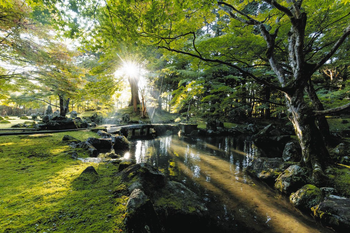 「琴橋」を渡って庭を一周する。普通に歩くと10分もかからないが、場所ごとに変化する苔の光り具合や、杉やカヤの大木の陰に岩々が和す光景に心を奪われていると、つい歩みは遅くなる。