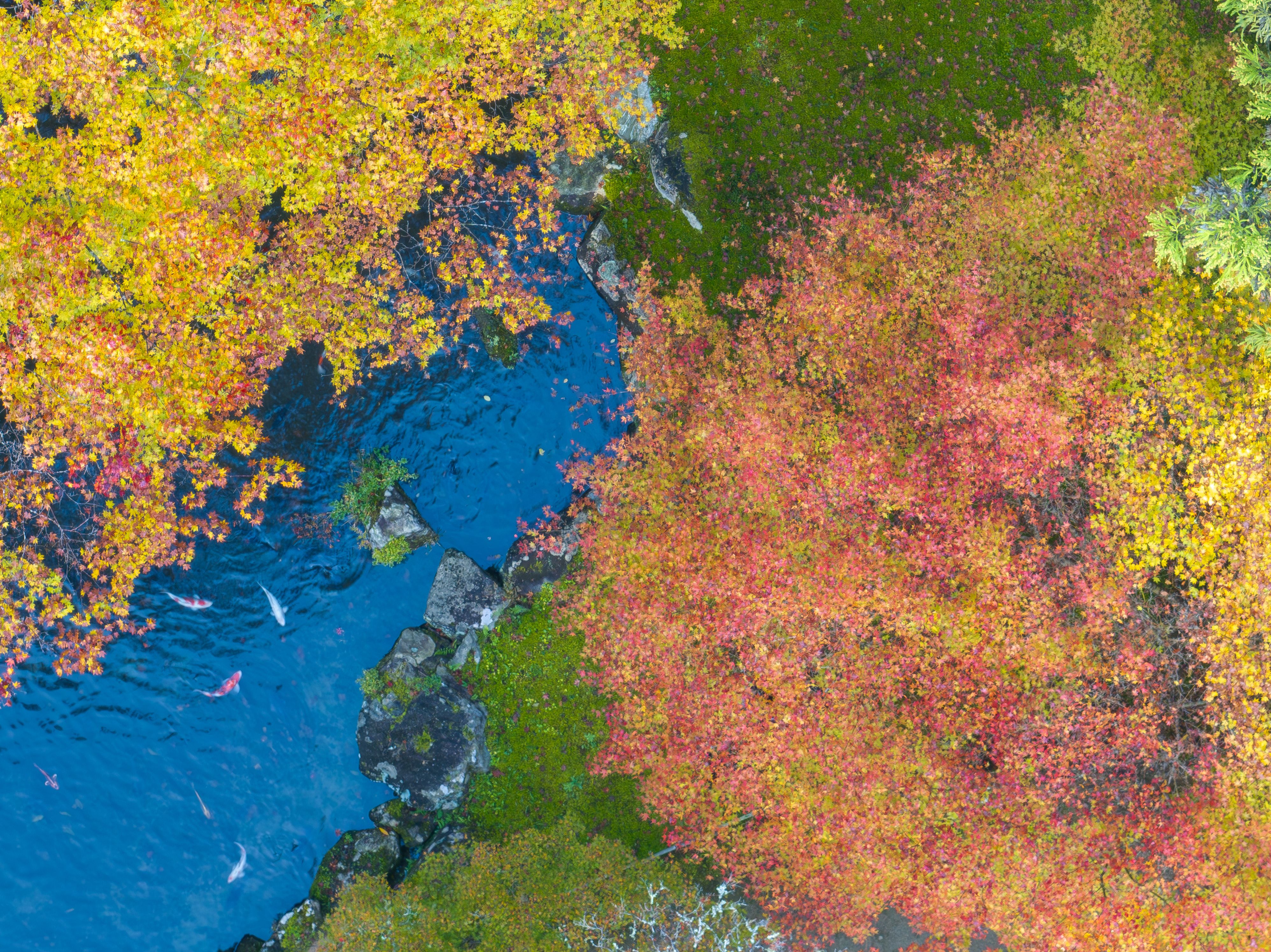 谷川から流れ込む池の水は透明で澄んでおり、コイが優雅に泳ぐ姿が見られる。