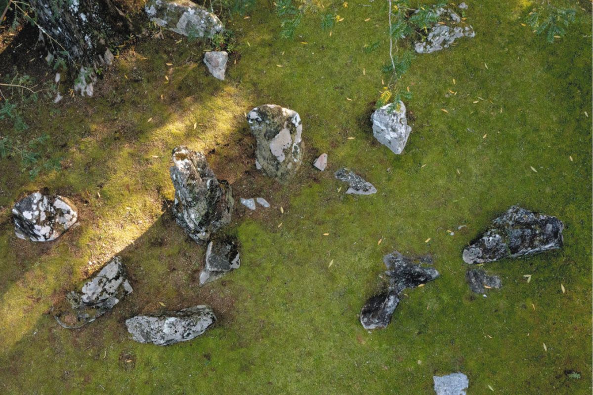 枯山水の石組みを真上から見ると、渦巻き状の配置が分かる