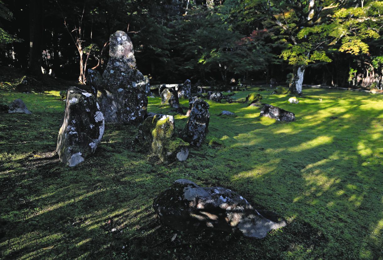 絵にうつし石をつくりし海山を後の世までも目かれずや見む。作庭者とされる室町幕府管領細川高国(1484~1531年)の辞世の句が庭の入り口に掲げてある。都で血で血を洗う権力争いに明け暮れ、果ては捕らえられ自害を余儀なくされた武将がなぜこんな郊外で庭づくりをといぶかしんだが、高国の娘が嫁いだ伊勢国司北畠晴具を頼って1529年からしばしこの地に滞在したのだという。