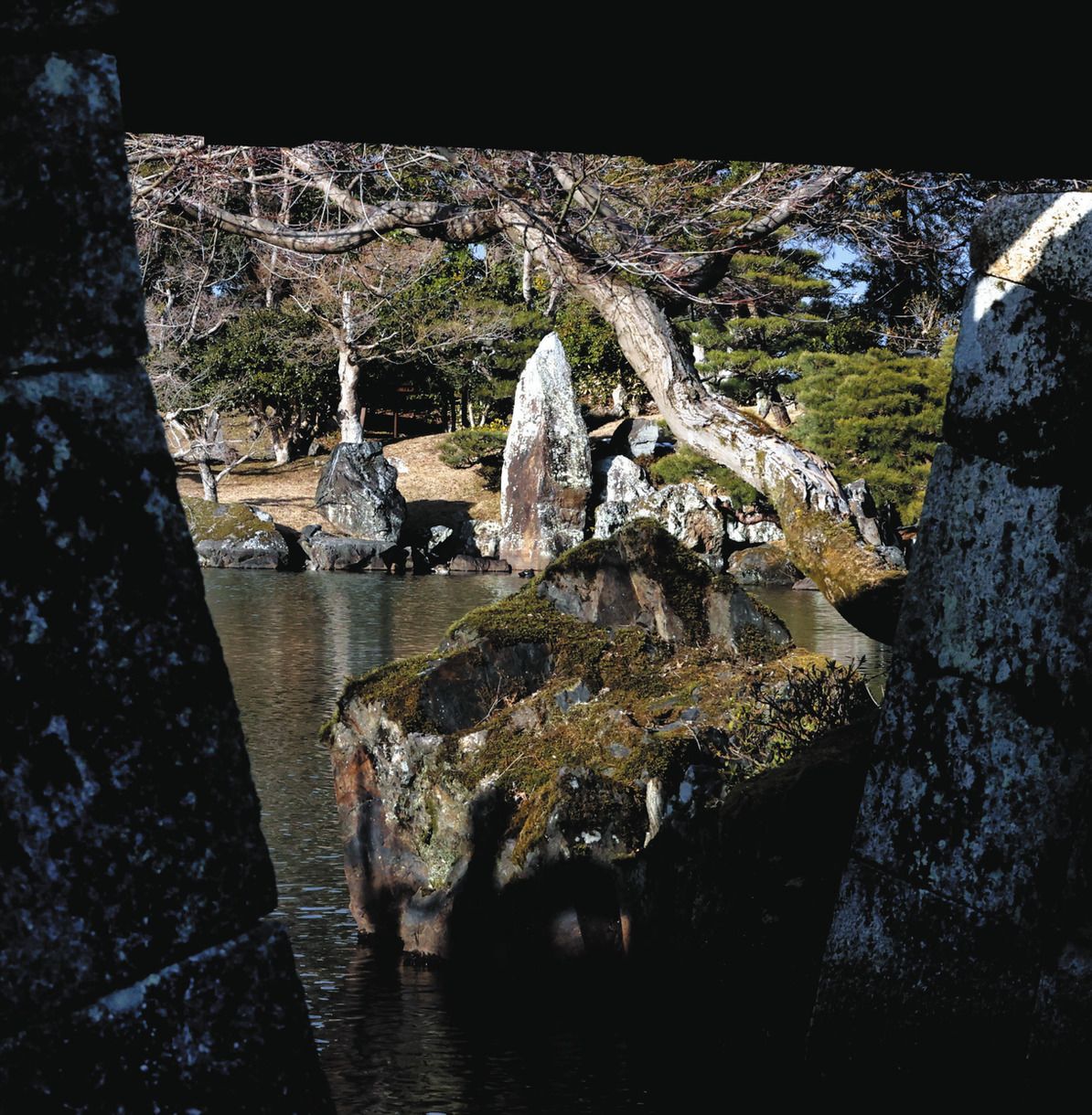 琵琶湖の岩礁「沖の白石」を模した、池の中にある石組み