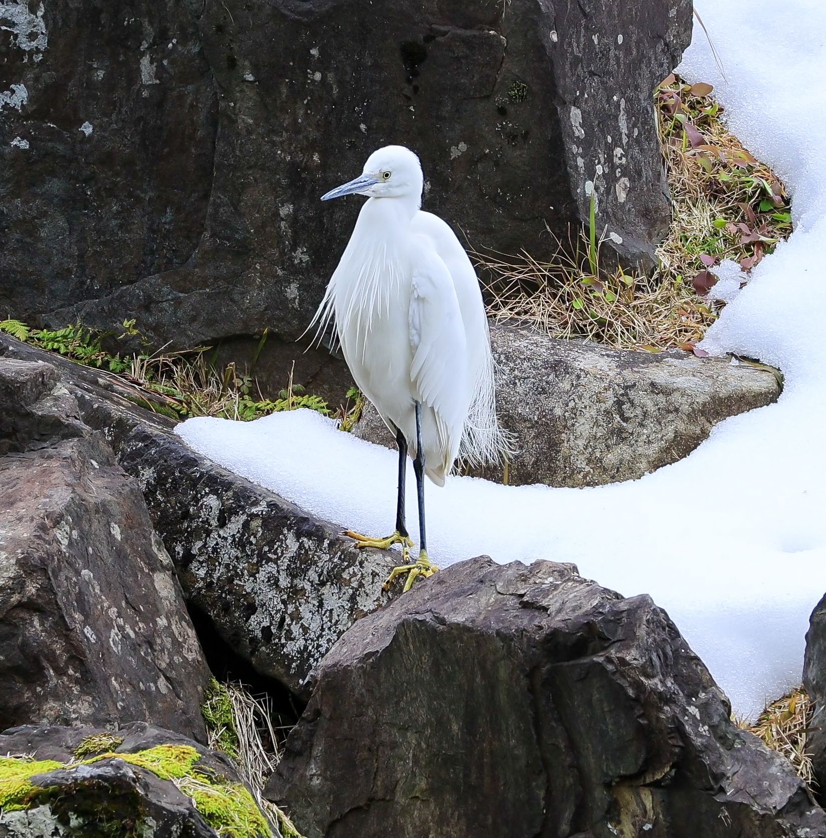 雪化粧した鶴鳴渚には、鶴石などの立石が組まれている