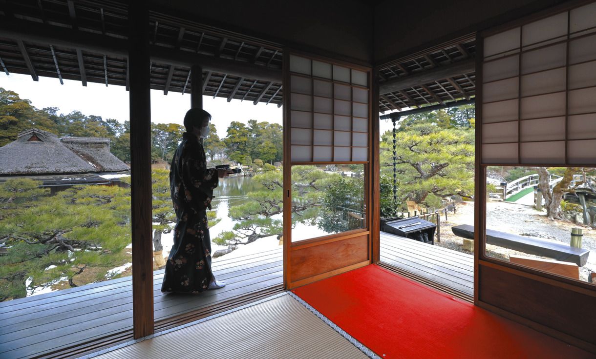すでに隠居していた11代藩主直中(なおなか)の十四男として、槻御殿で生まれ、幼少期を過ごした13代藩主直弼(なおすけ)は、鳳翔台(ほうしょうだい)などこの庭にあった四つの茶屋すべてを用いて茶会を催したという。彦根市観光文化戦略部の三尾(みお)次郎さんは茶会の意図の一つに「家臣との価値観の共有」があったと言う。