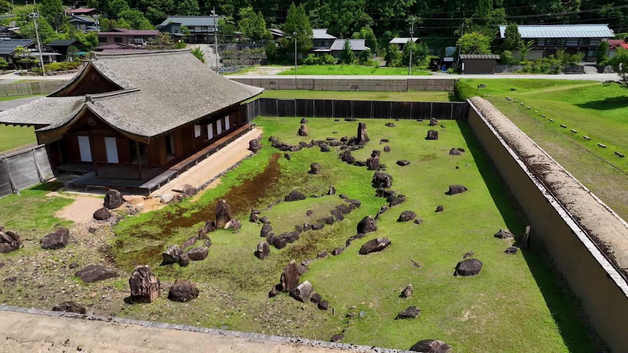 江馬氏は飛騨北部を治めた戦国武将で、飛騨の雄大な山並みを借景として取り込んだ壮大な庭を手がけた。発掘調査で戦国期の庭石のほか、武家屋敷の遺構が確認され、約500年前の景観を忠実に復元した庭園が整備された。
